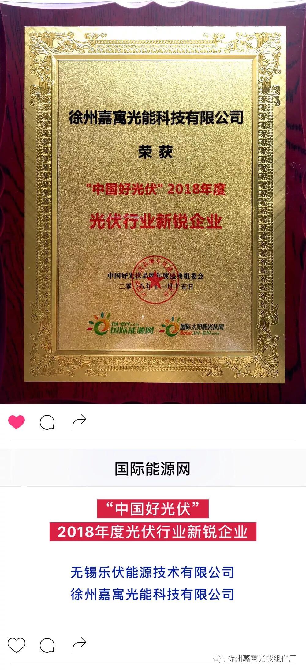 經過組委會、專家組的初評、核實、終評等的程序,嘉寓光能憑借自身卓*的產品性能斬獲 “中國好光伏組件十大供應商”大獎。同時,作為行業內的后起之秀,嘉寓光能如一匹黑馬,一次次驚艷了業內!此次更是同時獲得了“中國好光伏年度光伏行業新銳企業”。這是對嘉寓光能實力的高度肯定和2018年所取得成績的高度贊揚。