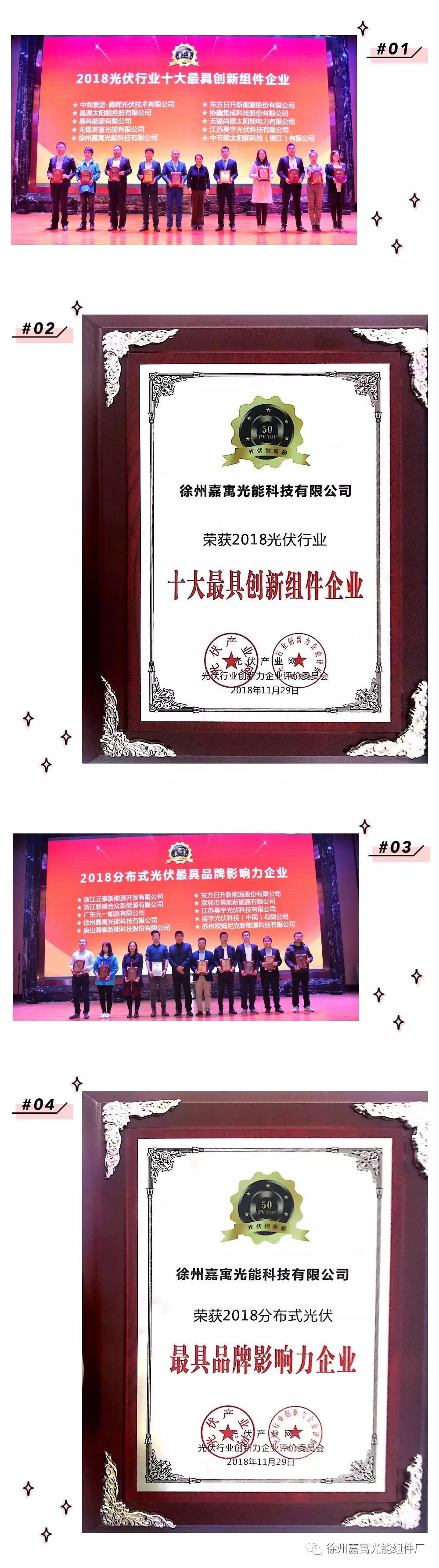 徐州嘉寓光能受邀參加此次盛典,憑借技術(shù)的創(chuàng)新以及高效的產(chǎn)品,再次斬獲“2018光伏行業(yè)十大最具創(chuàng)新組件企業(yè)” 以及“2018最具品牌影響力企業(yè)”兩項大獎。