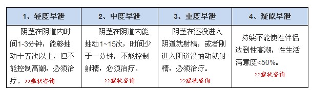 什么才是真正的早泄?早泄是指射精發生在陰莖進進陰道之前,或進陰道中時間較短,在女士尚未達到性高潮,提早射精而出現的不和諧障礙。早泄程度的評估分為輕度、中度、重度和正常四種狀況, 你可以根據以下分類進行自我檢測: